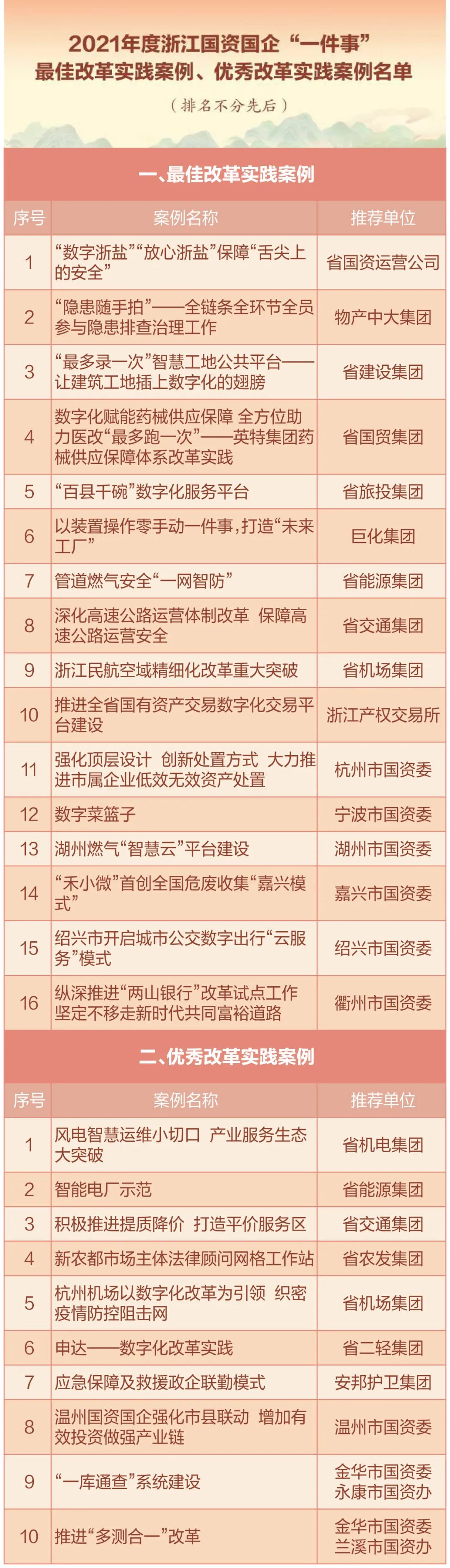 近日,浙江省國資委公布了2021年度浙江國資國企“一件事”最佳改革實(shí)踐案例和優(yōu)秀改革實(shí)踐案例名單,“數(shù)字浙鹽”等16個案例獲選為最佳改革實(shí)踐案例,“風(fēng)電智慧運(yùn)維”等10個案例為優(yōu)秀改革實(shí)踐案例。 此次推介的典型改革案例中,有事關(guān)百姓“舌尖安全”的食鹽智控平臺建設(shè),有全方位助力醫(yī)改的藥械供應(yīng)保障體系改革,有零手動操作的“未來工廠”實(shí)踐,還有全國首創(chuàng)危廢處置的“嘉興模式”……這些改革典型案例,充分展現(xiàn)了浙江國資國企改革全面發(fā)力、多點(diǎn)突破的良好態(tài)勢。而數(shù)字化改革、共同富裕探路、服務(wù)百姓民生,則成為了貫穿這些改革實(shí)踐的最高頻主題和最鮮明特色。 據(jù)悉,國企改革三年行動實(shí)施以來,浙江國資國企對標(biāo)對表打造“重要窗口”、建設(shè)共同富裕示范區(qū)新目標(biāo)新定位,以數(shù)字化改革為牽引,縱深推進(jìn)全省國資國企改革攻堅(jiān),涌現(xiàn)出一大批改革的好經(jīng)驗(yàn)、好做法。 為推廣改革經(jīng)驗(yàn)、強(qiáng)化典型引路,鼓勵全省國資國企改革創(chuàng)新、勇爭一流,更好地服務(wù)全省重大戰(zhàn)略和經(jīng)濟(jì)社會發(fā)展,浙江省國資委著眼于“小場景、大服務(wù)”,組織開展了2021年度浙江國資國企“一件事”最佳改革實(shí)踐案例推介活動。 活動啟動以來,全省國資國企積極參與,共推薦選送了70余個改革實(shí)踐案例。經(jīng)過初審初評、網(wǎng)絡(luò)投票和專家評審等環(huán)節(jié),最后共產(chǎn)生16個最佳改革實(shí)踐案例和10個優(yōu)秀改革實(shí)踐案例,打響了浙江國資國企“一件事”改革品牌。 隨著國企改革三年行動的全面收官,省國資委在推動各項(xiàng)改革任務(wù)全面盤點(diǎn)、對標(biāo)補(bǔ)差、落地見效的同時,將進(jìn)一步總結(jié)挖掘推廣改革典型經(jīng)驗(yàn),發(fā)揮先進(jìn)案例的示范帶動作用,更好以點(diǎn)帶面推動改革創(chuàng)新不斷深化,努力創(chuàng)造更多標(biāo)志性改革成果。 典型案例全名單 一起來看.jpg)