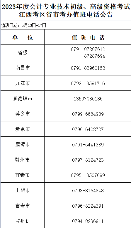 2023年全國會(huì)計(jì)專業(yè)技術(shù)初高級(jí)資格考試(江西考區(qū))將于2023年5月13日至17日在全省11個(gè)設(shè)區(qū)市舉行,考試期間考生可撥打以下對(duì)應(yīng)考區(qū)的值班電話,咨詢考試相關(guān)政策。