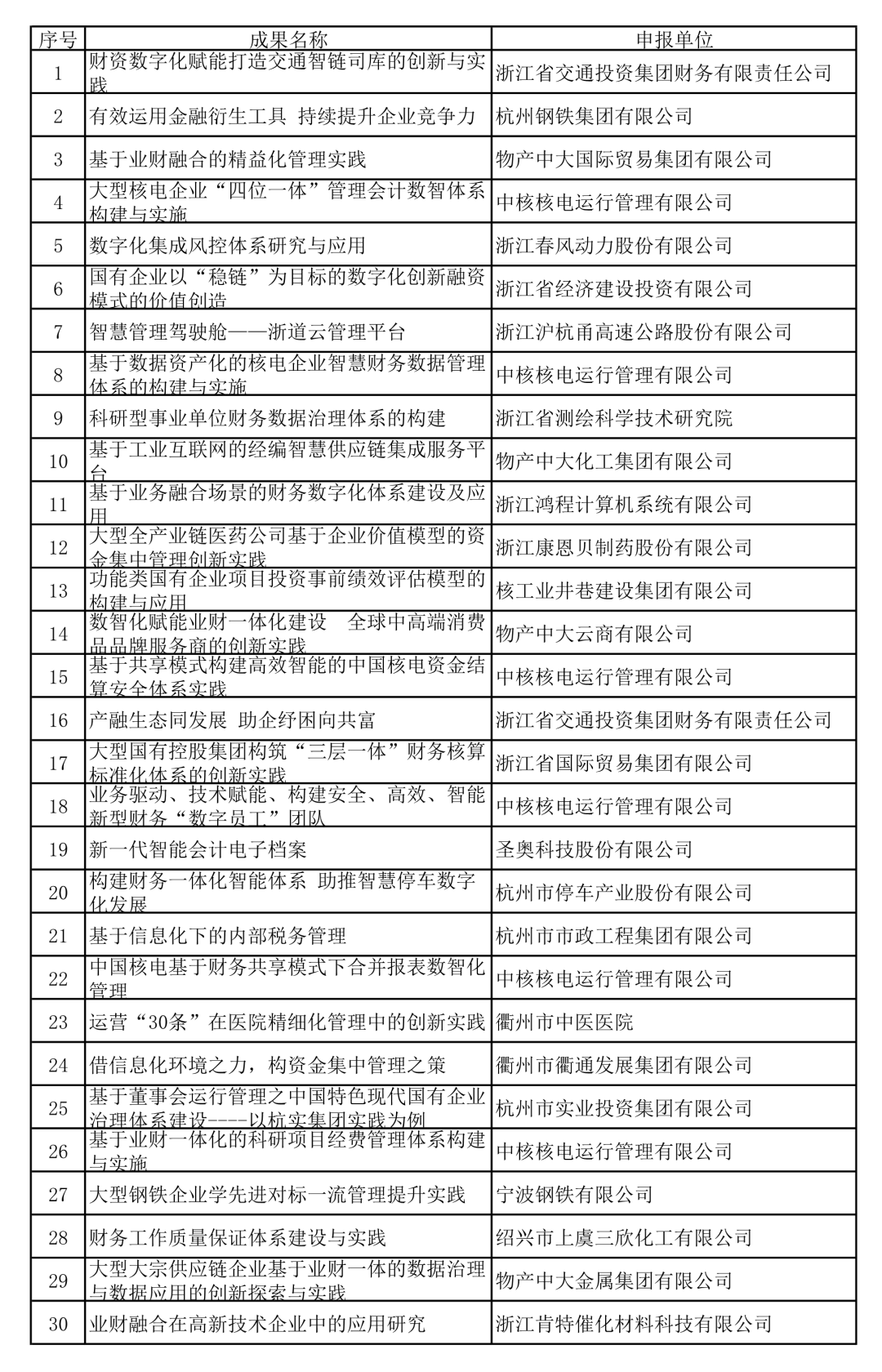 2023年度浙江省企業(yè)管理現(xiàn)代化創(chuàng)新成果(財務(wù)領(lǐng)域)的評審工作已于6月1日完成。經(jīng)專家評審并由評審委員會審定,有30項成果為擬獲獎成果,現(xiàn)根據(jù)《浙江省企業(yè)管理現(xiàn)代化創(chuàng)新成果(財務(wù)領(lǐng)域)評審辦法》,將擬獲獎成果進(jìn)行公示,公示期為5天(2023年6月2日至6月6日)。